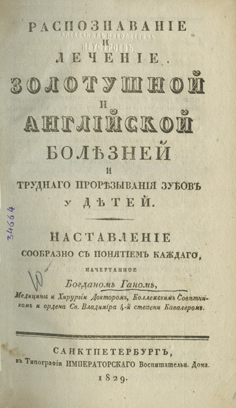 BOGDANOVICH (Bogdan), "Reconnaissance et traitement des maladies scrofuleuses, du rachitisme et des difficultés de dentition chez les enfants", Imprimerie de la Maison d'Education Impériale, Saint-Pétersbourg, (1829)